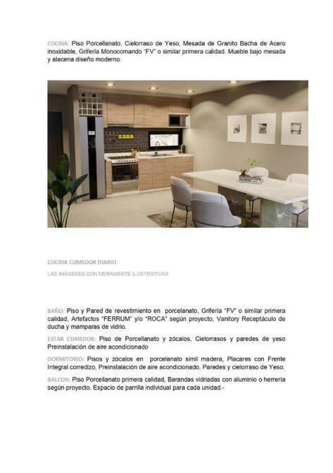 COCINA COMEDOR DIARIO LAS IMÁGENES SON MERAMENTE ILUSTRATIVAS BAÑO: Piso y Pared de revestimiento en porcelanato, Grifería “FV” o similar primera calidad, Artefactos “FERRUM” y/o “ROCA” según proyecto, Vanitory Receptáculo de ducha y mamparas de vidrio. ESTAR COMEDOR: Piso de Porcellanato y zócalos, Cielorrasos y paredes de yeso Preinstalación de aire acondicionado DORMITORIO: Pisos y zócalos en porcelanato simil madera, Placares con Frente Integral corredizo, Preinstalación de aire acondicionado, Paredes y cielorraso de Yeso. BALCON: Piso Porcellanato primera calidad, Barandas vidriadas con aluminio o herrería según proyecto. Espacio de parrilla individual para cada unidad
