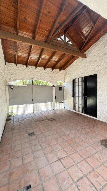 Entrada de auto cubierta (posible pasante), con parque lateral de aproximadamente 2,70 x 17 metros que conecta ambas unidades