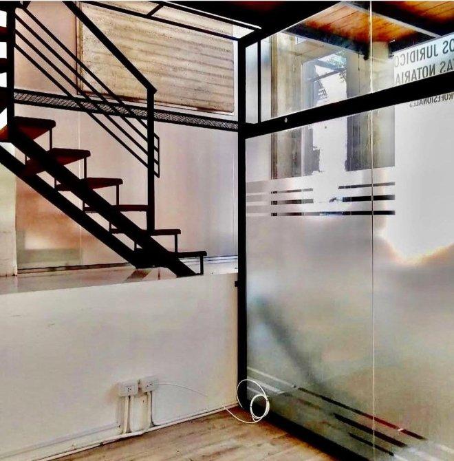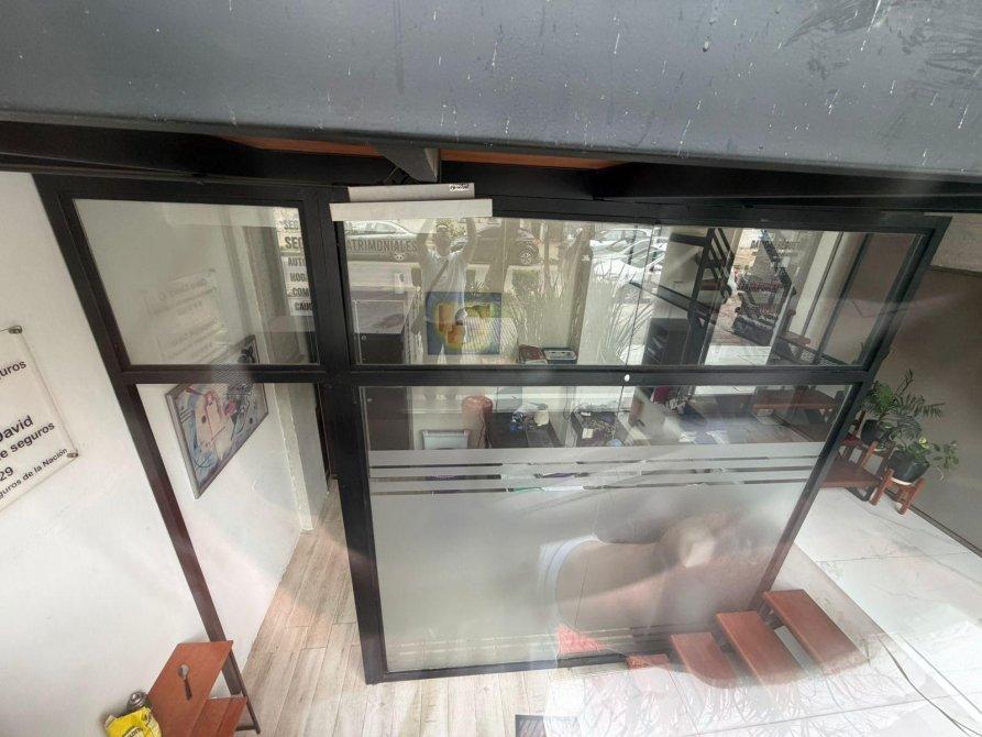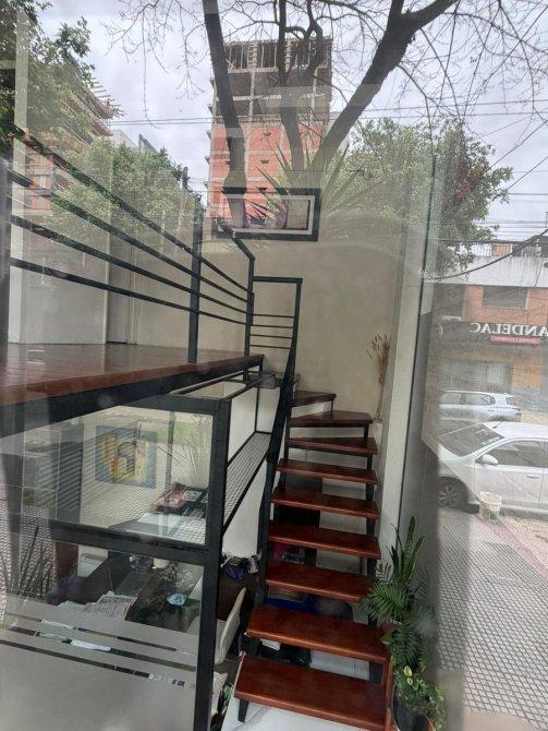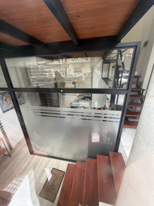 Local desarrollado en dos niveles, con paneles fijos de blindex, diseño moderno, escaleras en madera y hierro, y frente de acero inoxidable. Cuenta con baño.