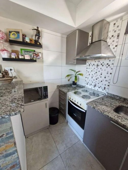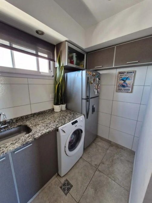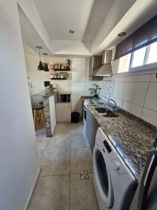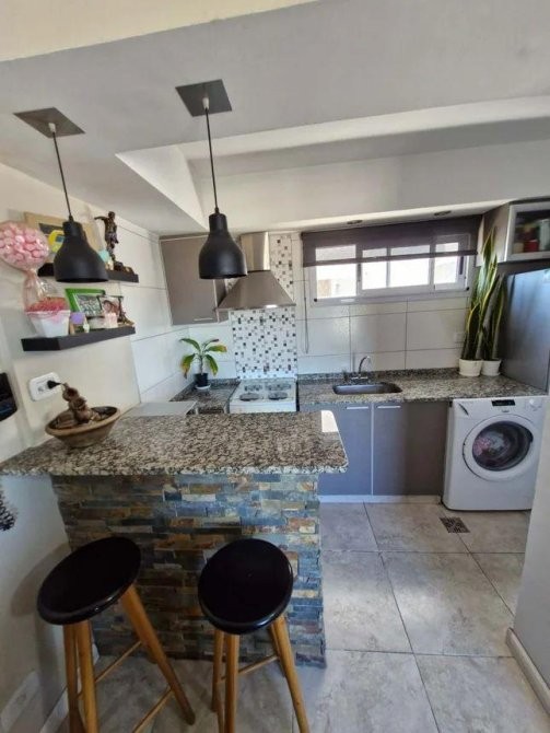 Cocina moderna, completamente equipada, con barra desayunadora, extractor y espacio para lavarropas.