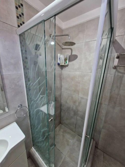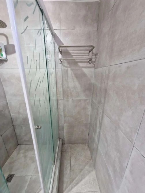Baño de diseño moderno, con mampara, bidet y espacio de guardado.